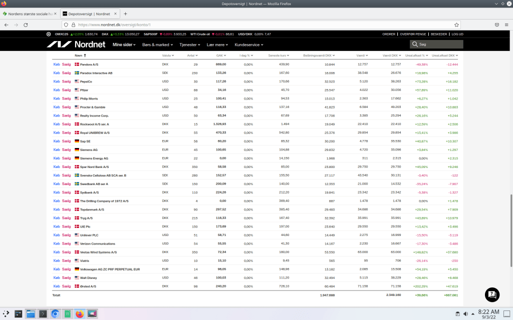 I skrivene stund er min portfolio på 2.349.160 dkk hvoraf 667.061 dkk er ureliseret gevindst. Dvs mit portfolio er steget medd ca 40.000 dkk siden november sidste år (https://financialindependent.finance.blog/2021/11/13/ny-personligt-rekort/). Dette skyldes hovedsageligt at jeg har fået købt op i div virksomheder da min ureliseret gevindst siden dengang er faldet med ca 140.000 dkk.