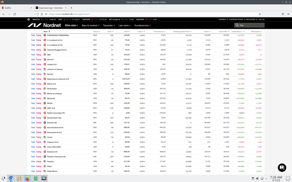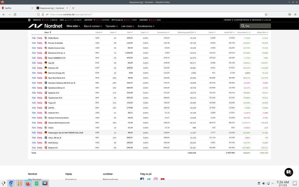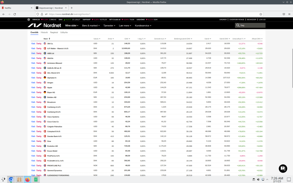 I skriveve stund er mine aktier 2.443.361 dkk værd hvor af 701.073 dkk ikke er reliseret endnu.