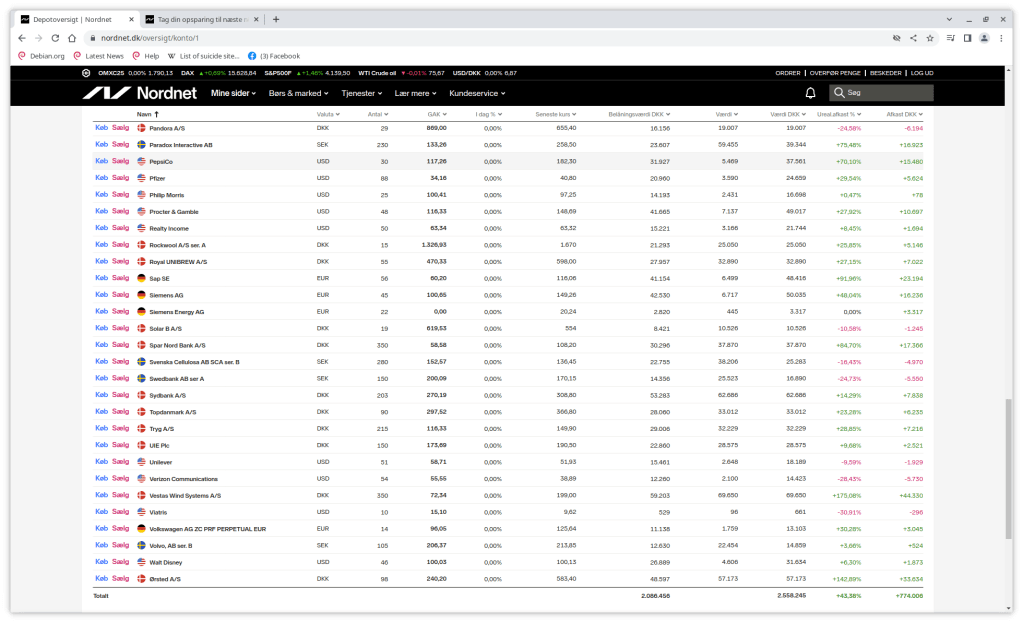 I skrivene stund er mit portfolio på 2.558.245 dkk hvoraf 774.006 dkk ikke er reliseret endnu. Og jeg har fået 73641.79 dkk igennem det sidste 12 måneder. Det giver en gennemsnitlig ekstra indkost på 6136.82 dkk pr måned igennemsnit.