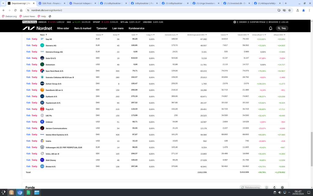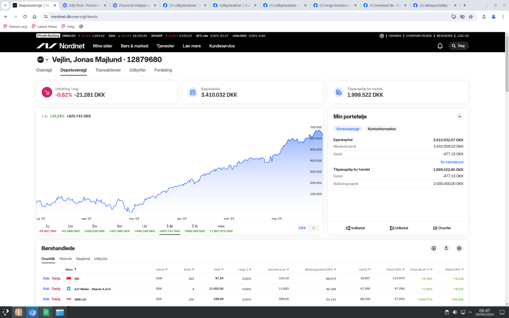 I skrivene stund er mit portfolio på 3.410.509 dkk hvoraf 1.276.002 dkk ikke er reliseret endnu. Det er en stigning på hhv 751.579 dkk og 479.307 dkk fra sidste år: https://financialindependent.finance.blog/2023/07/06/udbytte-i-juni-2023/ )