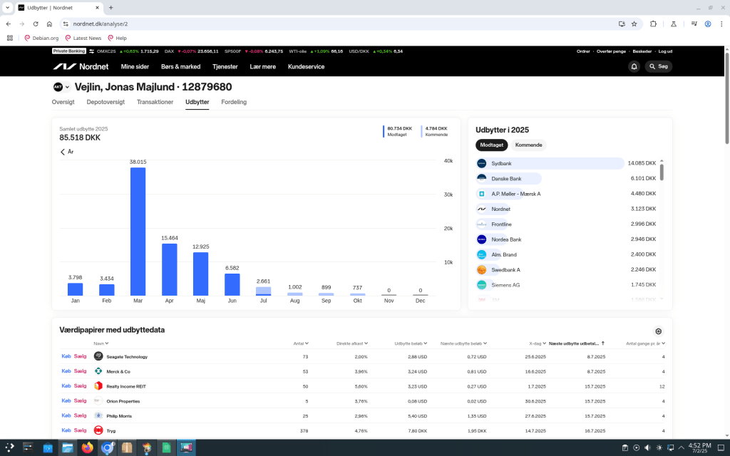 Dette skyldes hovedsageligt at Danske bank udgave extra ordinære udbytte i juli 2024 som vi ikke fik i år. Samt Fronline udbytte faldt en måned tidligere i år. Opkøbet i Seagete https://financialindependent.finance.blog/2025/03/30/seagate-technology-stx/ var desvære ikke nok til at opveje dette.